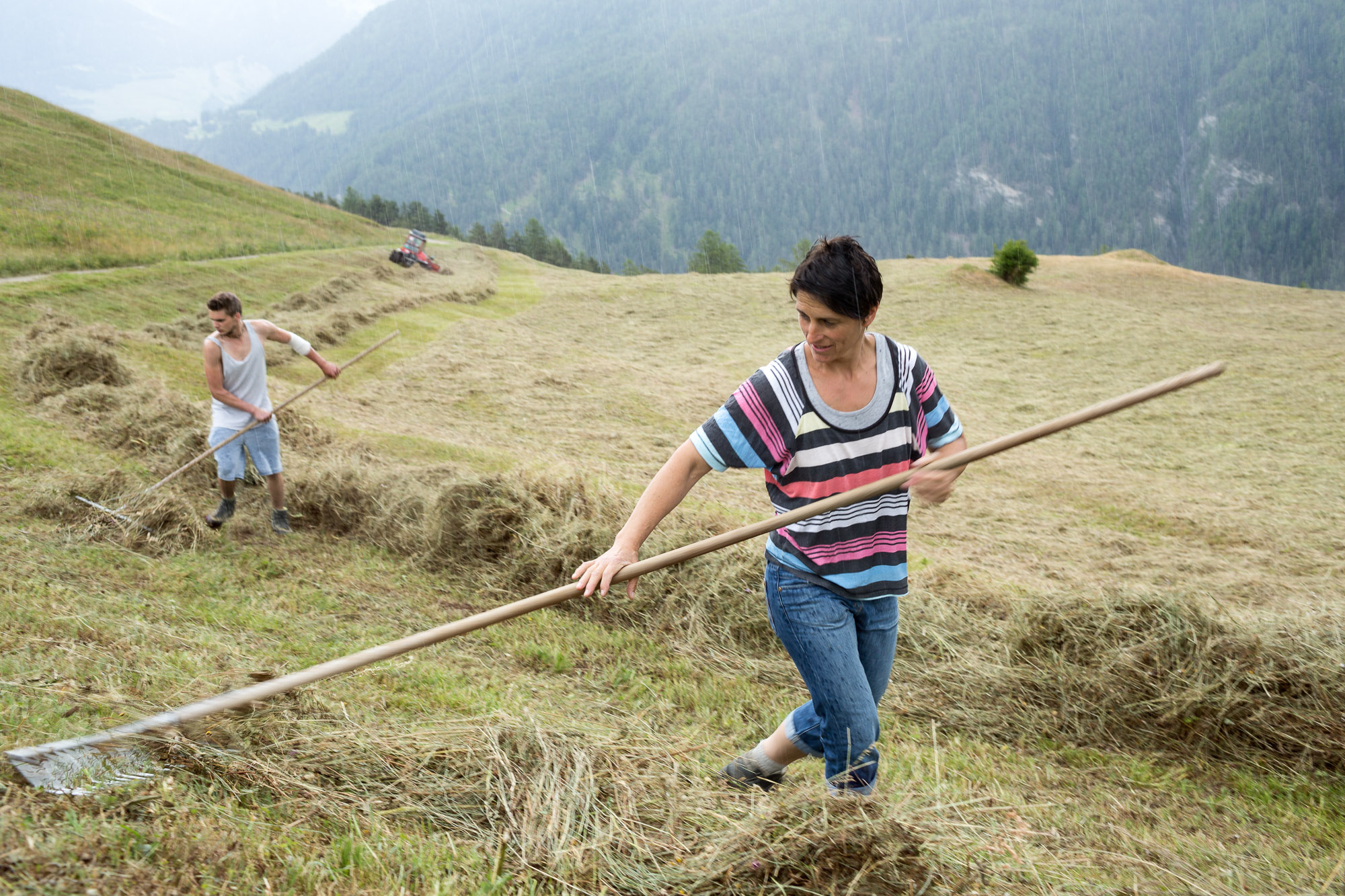 Die Schafüchterin Ursinai Caviezel und ihr Sohn Andri bei der Heuernte.