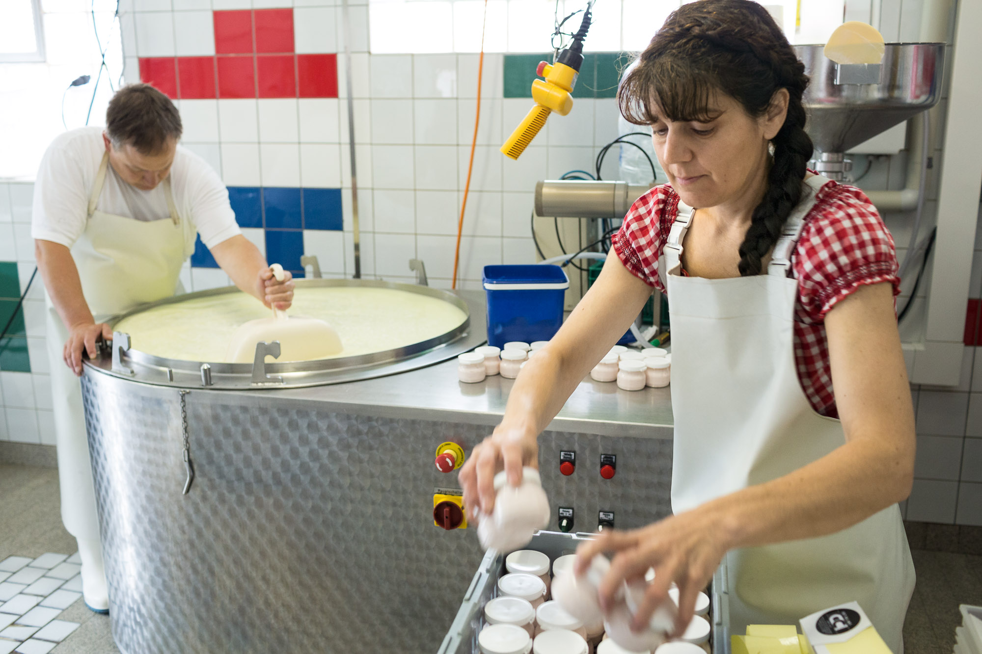 Chatrina und Peter Mair füllen in der Dorfkäserei Schafjoghurt in Gläser ab.
