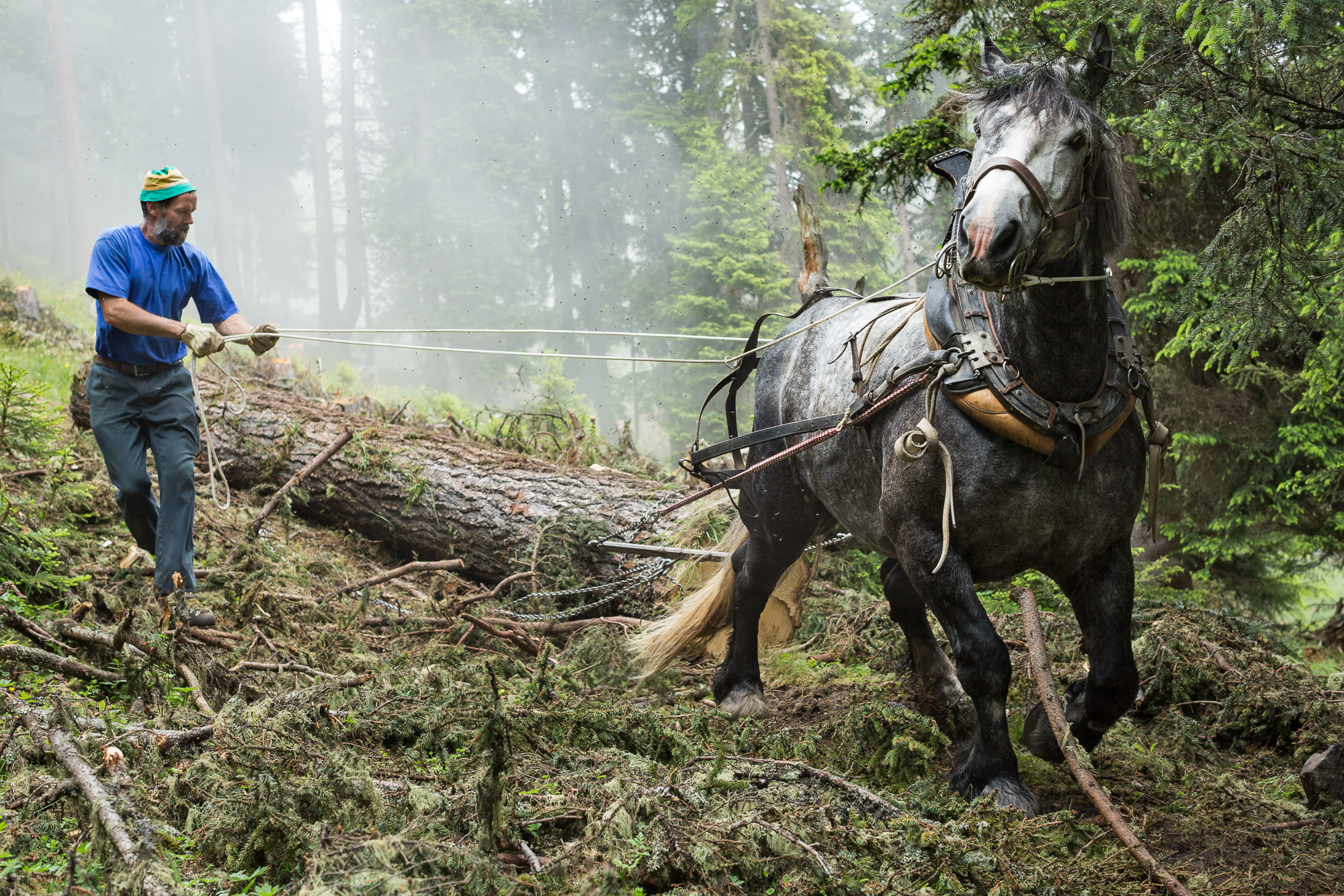 Gian Denoth schleift mit seinem Wallach Rio de la Roche Fichtenholz aus dem Wald.