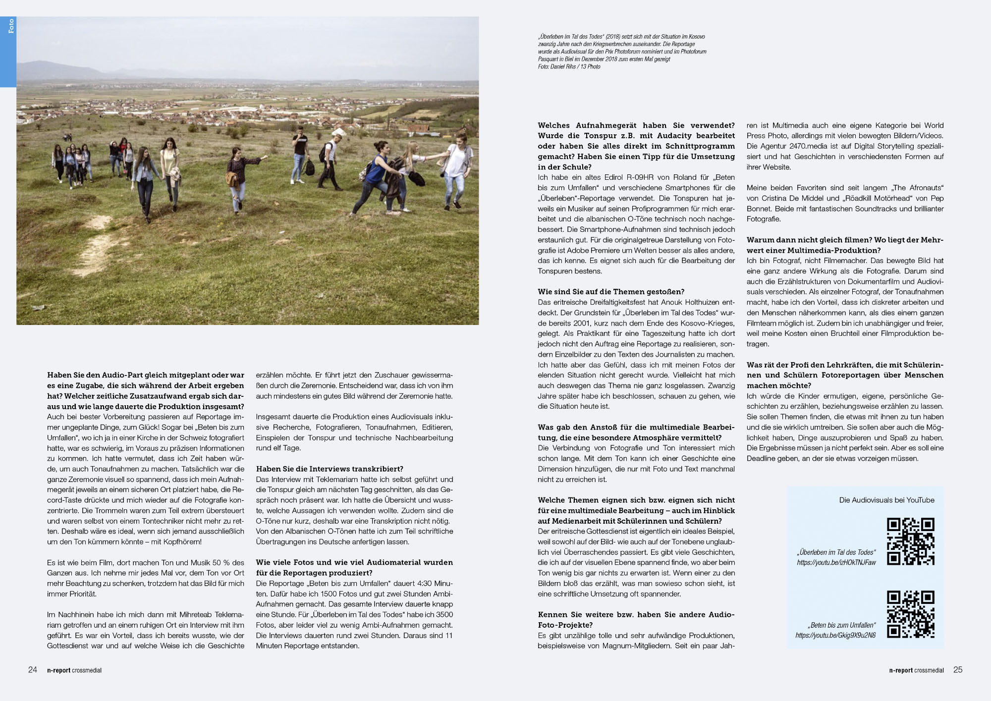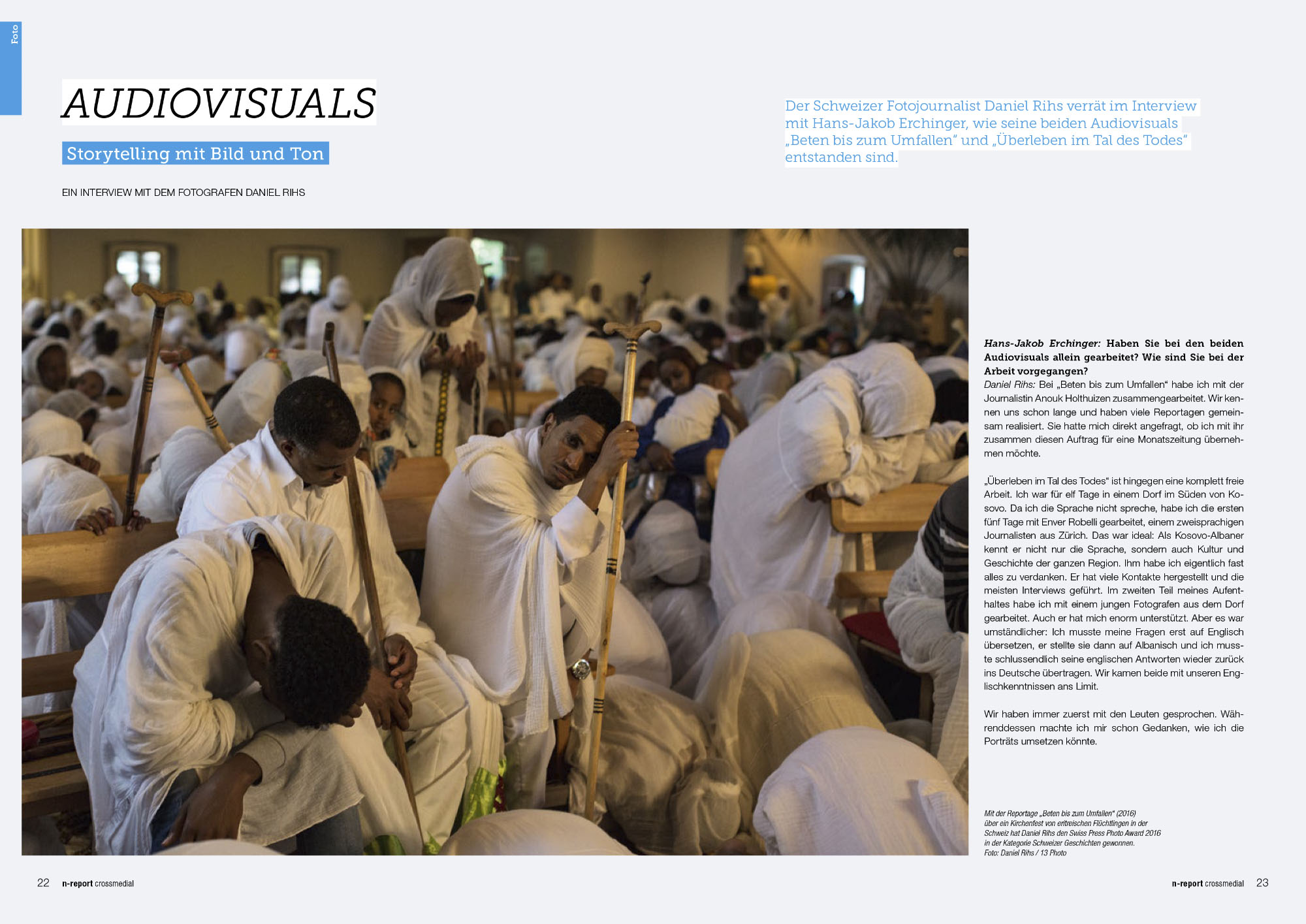 Die deutsche Zeitschrift n-report interviewt Daniel Rihs zu seinen zwei Audiovisuals «Beten bis zum Umfallen» und «Überleben im Tal des Todes», die in der Schweiz und im Kosovo entstanden sind. Daniel Rihs gewann mit seiner Reportage über die eritreische Gemeinschaft «Beten bis zum Umfallen» den Swiss Press Photo Award 2016.